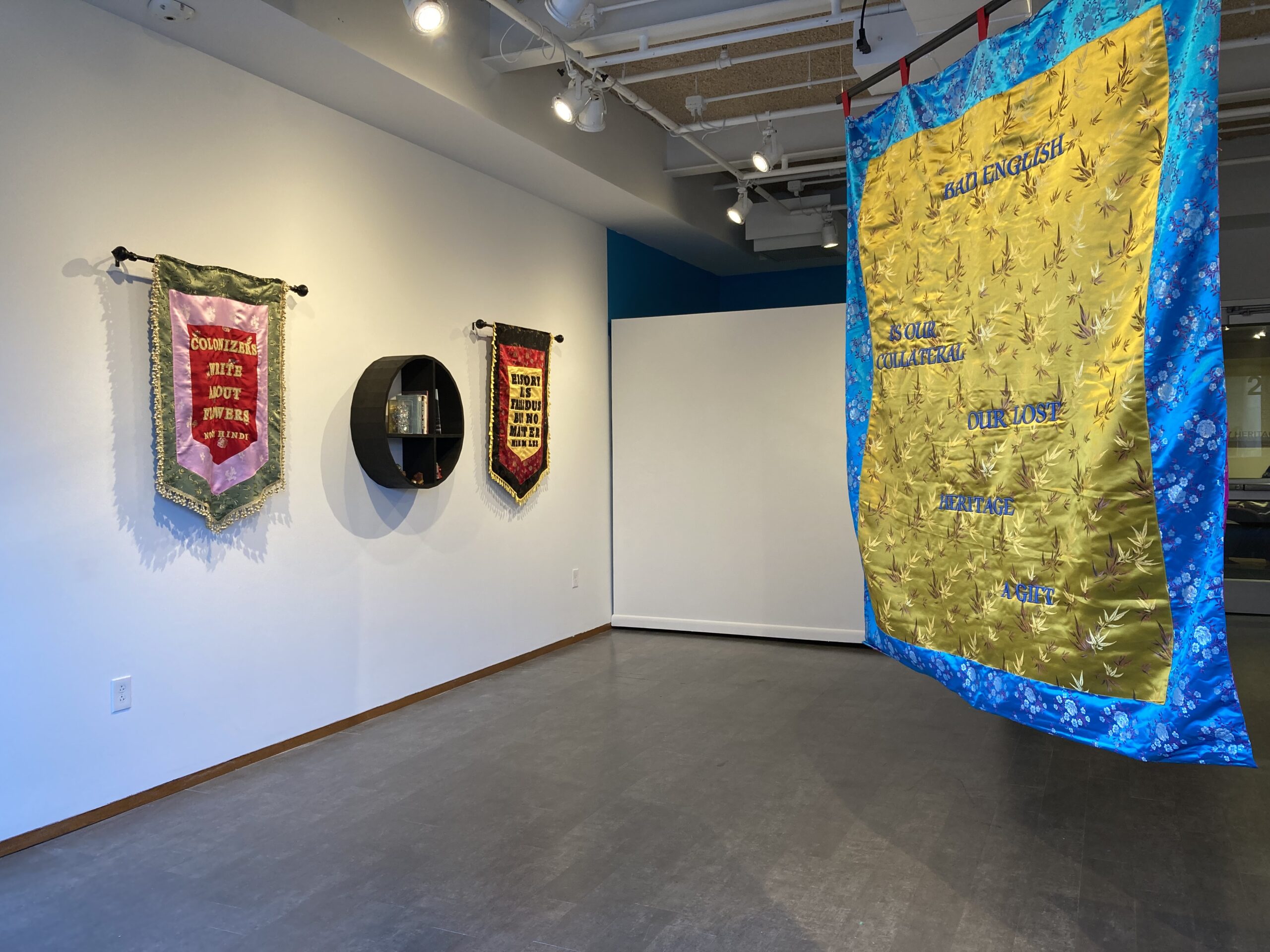 Taking its title from a quote in Theresa Hak Kyung Cha’s Dictée, the exhibition features passages from writers of Asian heritage, which are stitched and embroidered into brocade banners. The intricate pattern of the fabric obscures parts of the words, mimicking the ways in which migration can unsettle memory and render us unintelligible. Alongside the banners are two bookcases containing personal ephemera from the artists and copies of the referenced texts bookmarked on favorite pages. Inspired by East Asian ancestral altars, the bookcases invite visitors to treat the books with reverence while simultaneously presenting them as the literary inheritance of future generations.