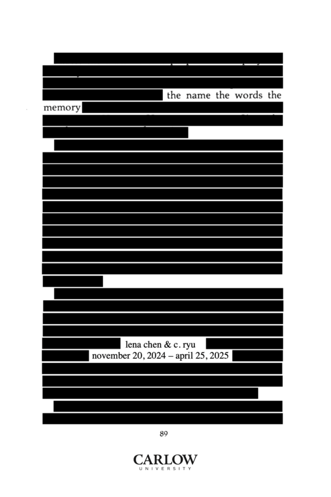 Transforming Carlow University’s gallery into a reading room, this exhibition by artistic collaborators Lena Chen and C. Ryu draws from Asian diasporic literature to reveal the impact of colonialism, conflict, and migration on our relationship to language.