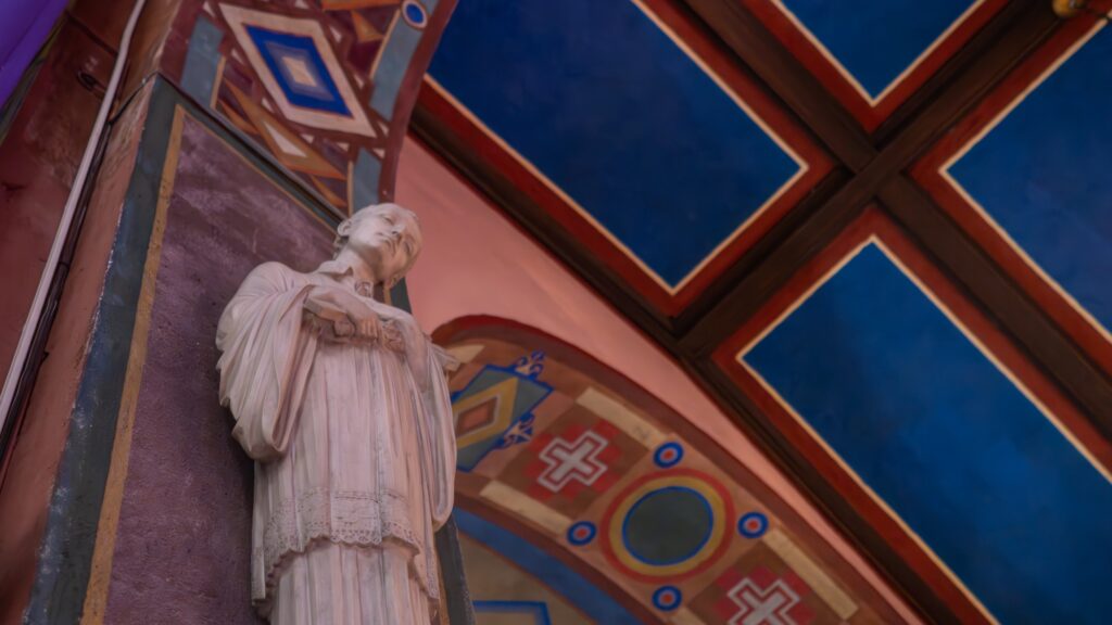 It may be what you are supposed to see: the statues that adorn the sides of the altar, the frescoes of women saints on the ceiling, or the marvelous stained glass windows depicting stories from the Bible.